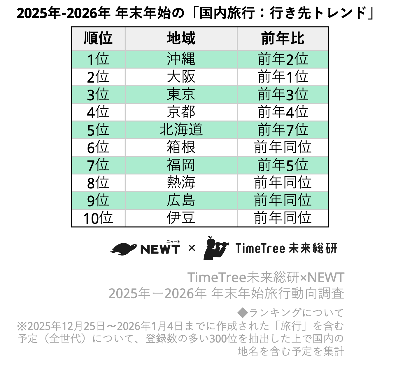 『TimeTree未来総合研究所』(https://timetreeapp.com/intl/ja/future-research-institute)と旅行アプリ『NEWT(ニュート)』は、共同で2025年〜2026年・年末年始の旅行動向を分析しました。TimeTree未来総研は、年末年始(2025年12月25日〜2026年1月4日)に登録された「旅行」を含む予定データを分析し、旅行アプリ『NEWT』は同アプリにおける予約データを解析しました。