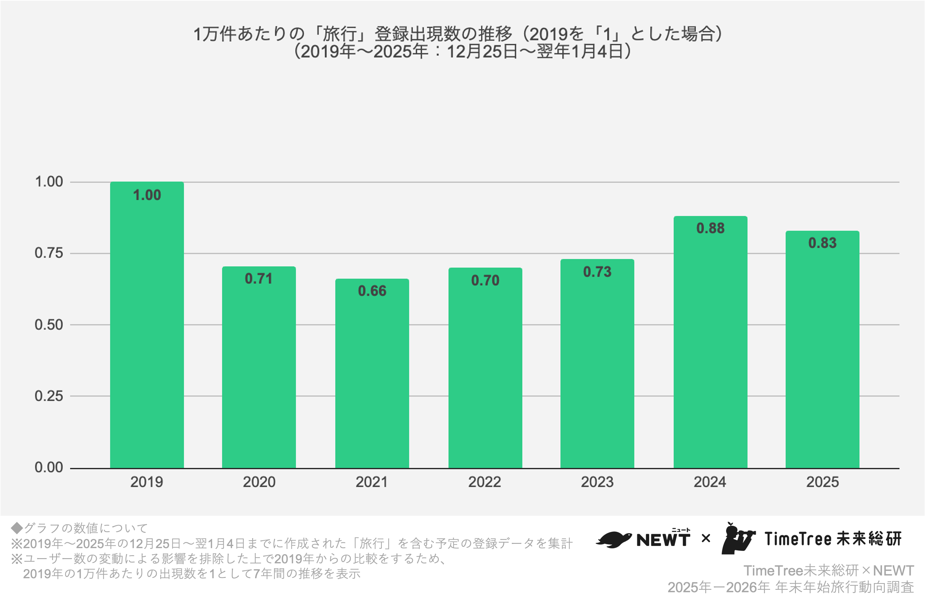 TimeTreeに登録された予定データから、2019年以降7年間における年末年始(12月25日〜翌年1月4日)の「旅行」予定の推移を分析した結果、2025年の年末年始の旅行予定登録数は2019年比で83%となりました。一時期はコロナ禍の影響で大きく減少しましたが、2022年以降は回復基調に転じ、2023年73%、2024年88%と上昇を続けてきました。2025年は前年を5ポイント下回ったものの、コロナ前の8割超の水準を維持しており、回復基調は継続しています。一方で、物価高や宿泊費の上昇を背景に、日本人の旅行需要の伸びに一服感が見られる結果となりました。