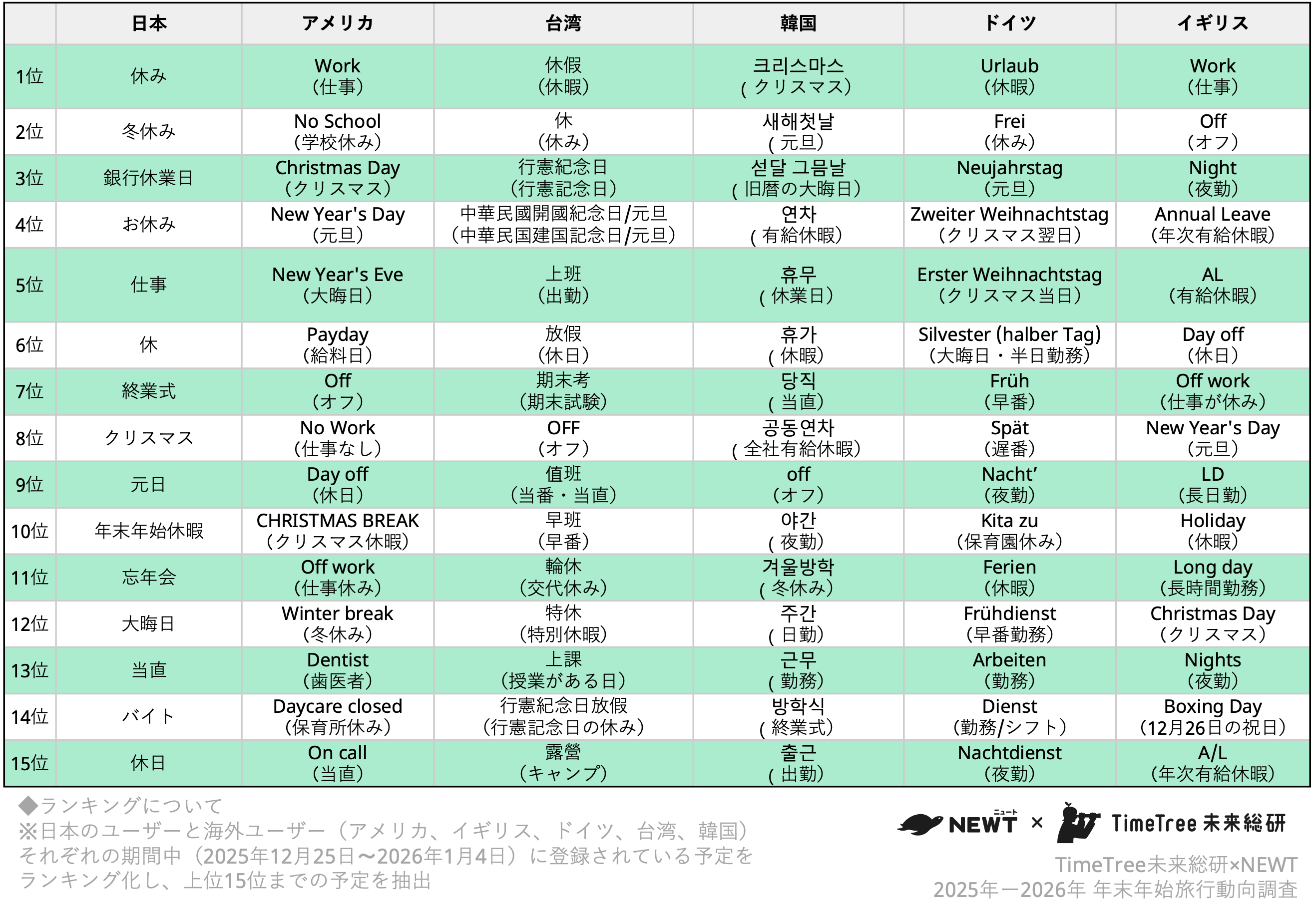 一方、アメリカとイギリスでは「Work(仕事)」が1位となり、年末年始も通常営業を継続する社会が反映されています。興味深いことに、イギリスでは「Boxing Day(12月26日の祝日)」、ドイツでは「Zweiter Weihnachtstag(クリスマス翌日)」が上位に入っており、両国ではクリスマスの翌日も祝日として定着している文化の違いも見られます。