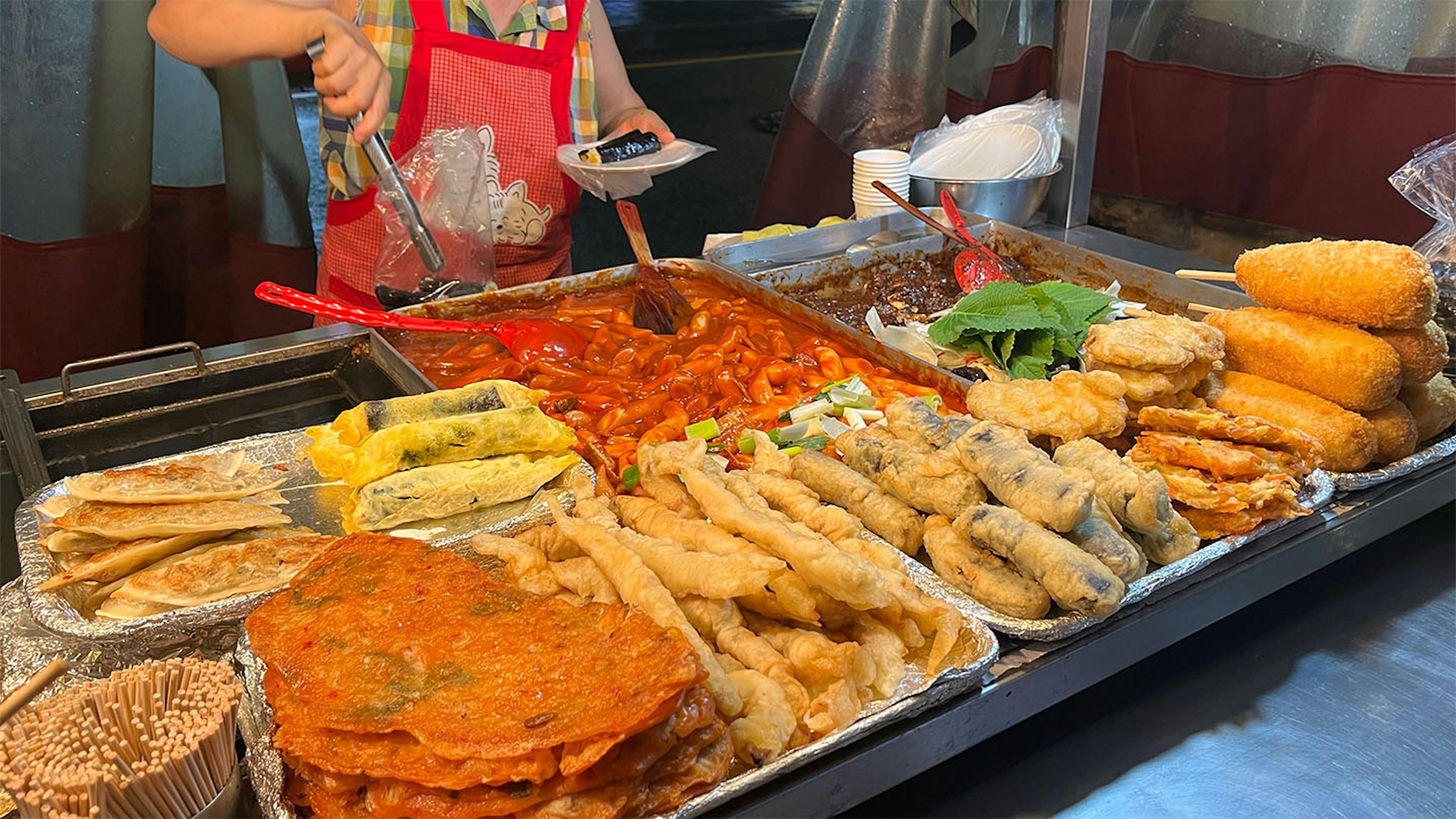 東大門で屋台飯を楽しむなら、東大門総合市場の西側裏通りにある食べ物屋台通りがおすすめ。ここ以外にもミリオレなどの大型ファッションビルが続く通りや、dundun 東大門店がある交差点を乙支路方面に向かう通り沿い、DDPの並びで卸問屋が集まるファッションビル「apM」の前などにも屋台があります。