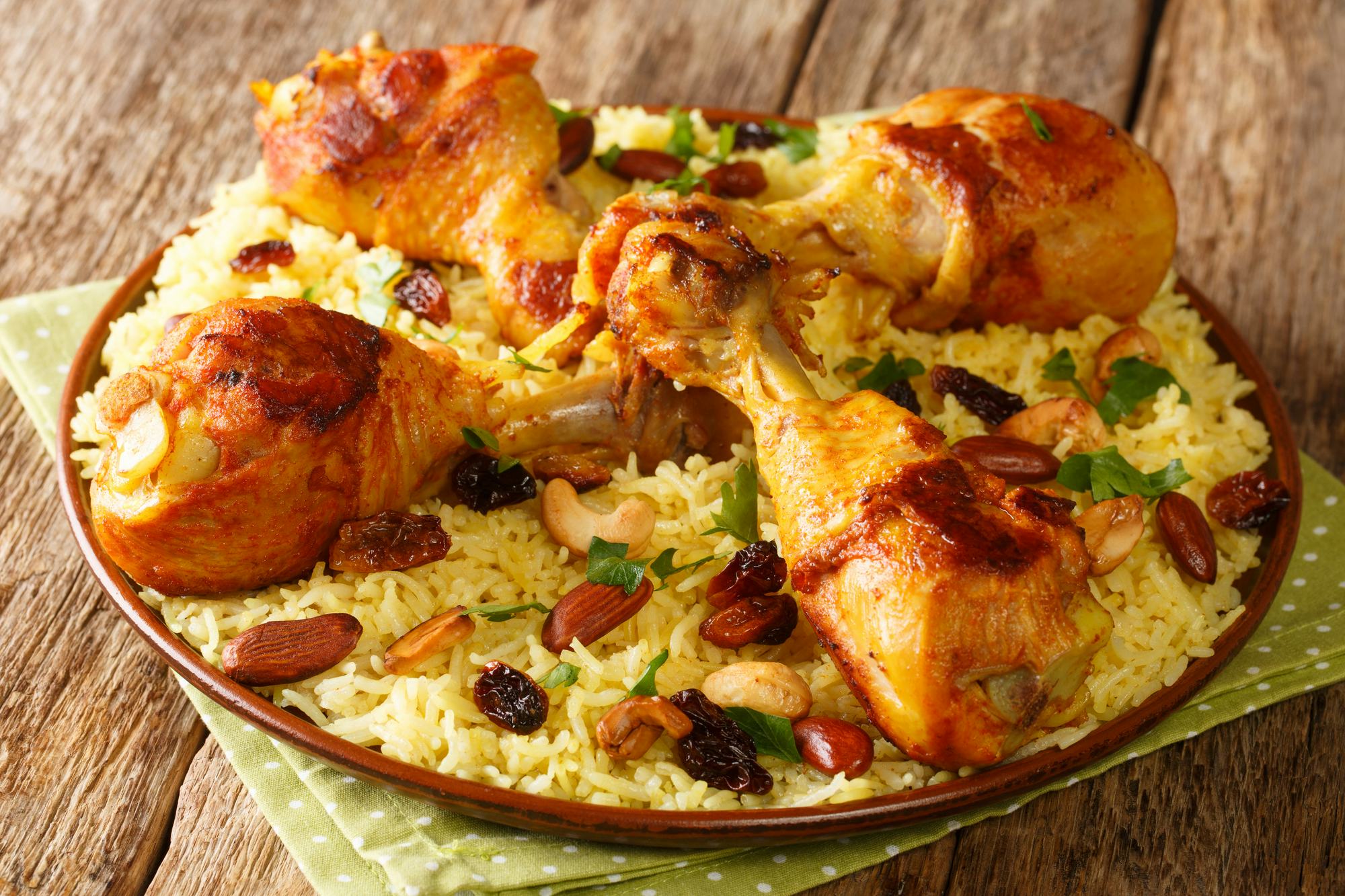 マチブースは、クウェートの国民食とも言える人気料理です。スパイシーな炊き込みご飯に、鶏肉やラム肉を加えて煮込みます。