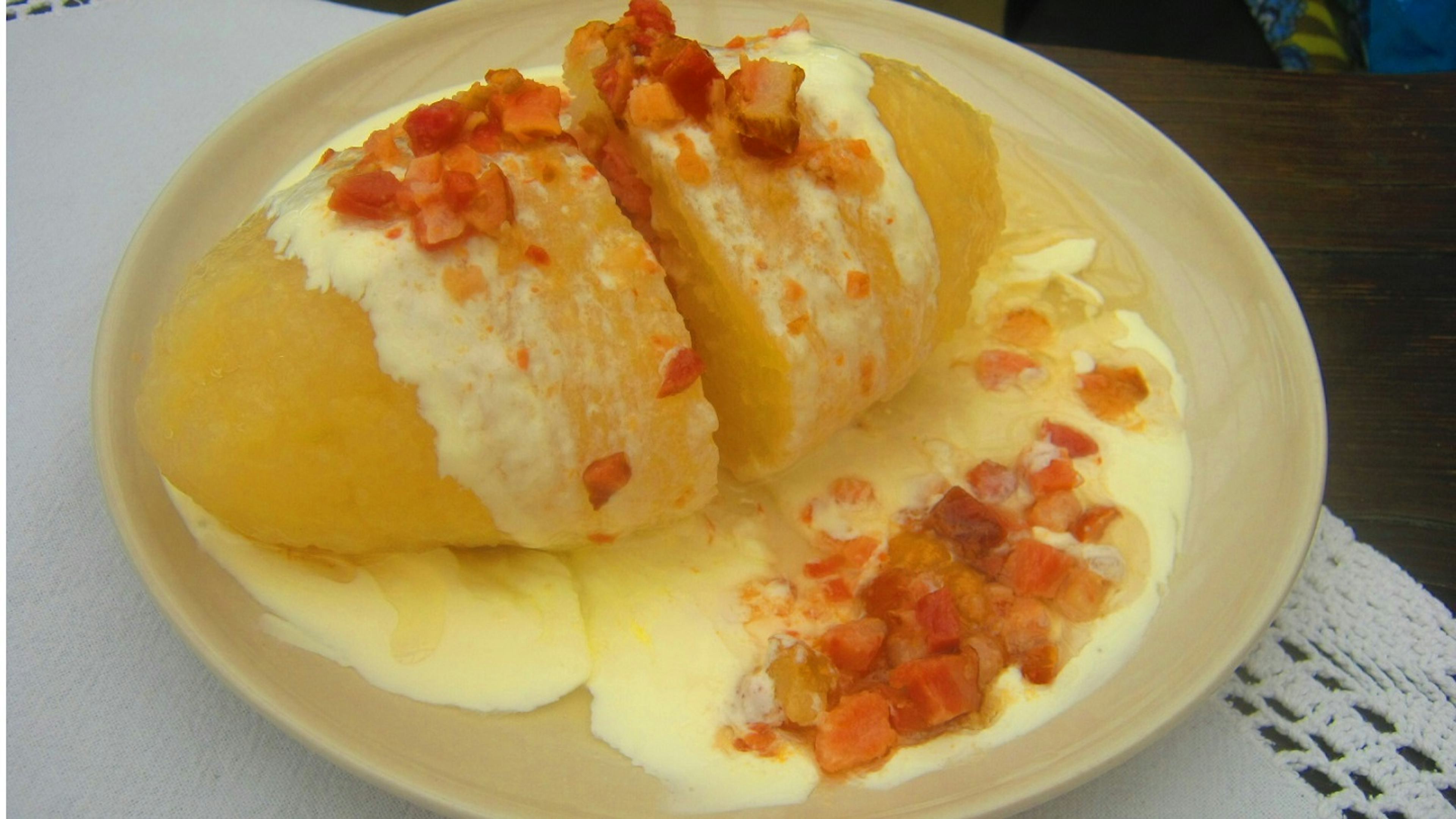 ヴェダライは、豚の腸に詰めたソーセージのような料理で、中身はジャガイモ、ベーコン、玉ねぎを混ぜ合わせたものです。オーブンでじっくり焼き上げることで、外はカリカリ、中はホクホクとした食感になります。家庭料理として親しまれており、特に寒い季節に人気です。