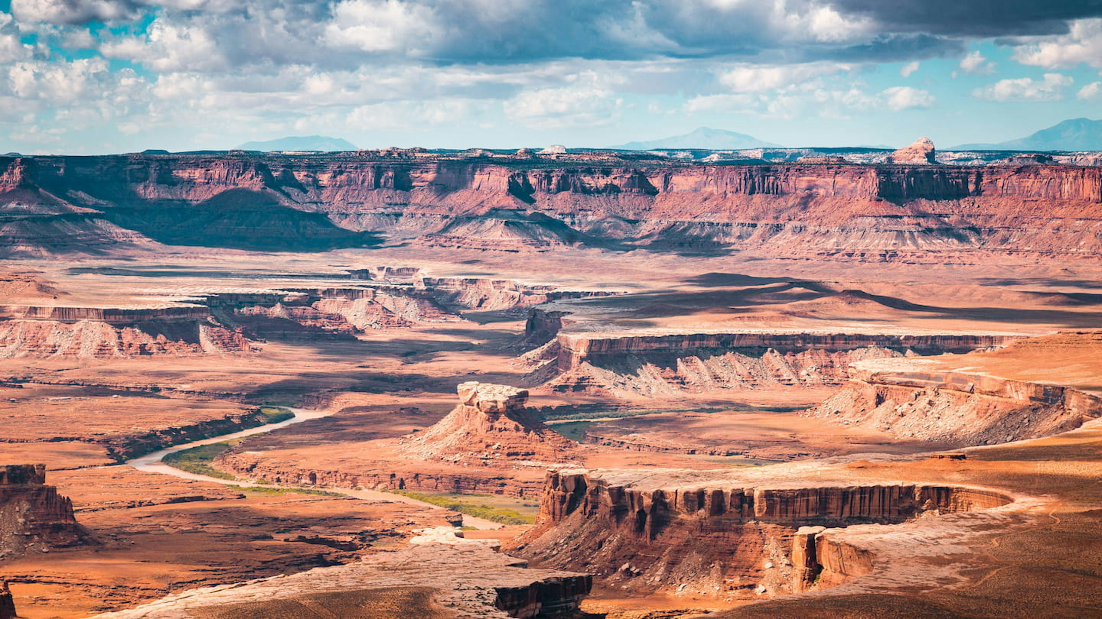 コロラド川とグリーン川は国立公園内で合流。公園内はその川によって隔てられたアイランド・イン・ザ・スカイ、ニードルス、メイズという3つのセクションに分かれています。最もアクセスしやすく、見どころが多いのはアイランド・イン・ザ・スカイ。その最南端にあるグランドビュー・ポイントからは、峡谷全体を見渡すことができます。