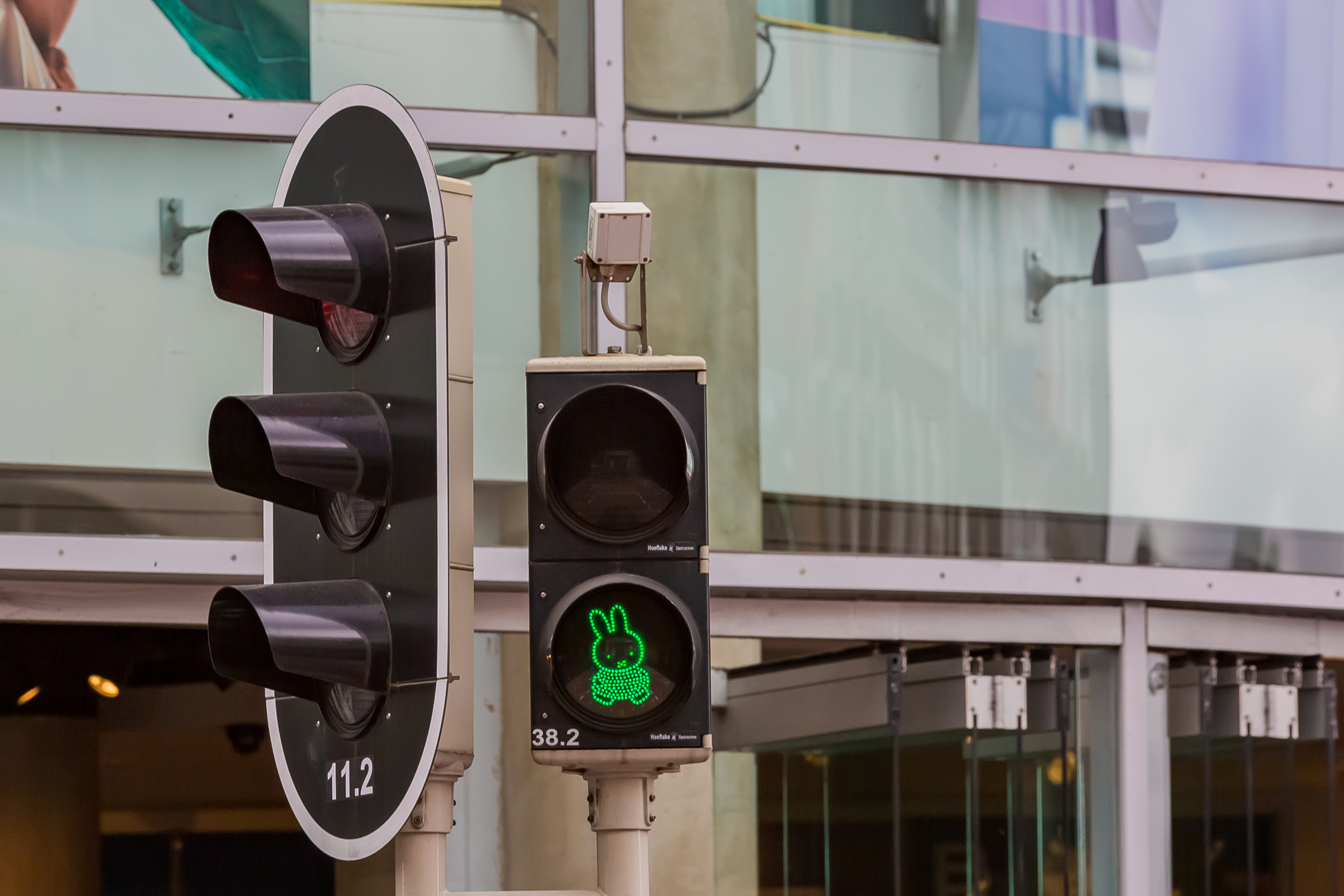 この信号機は、高級デパートde Bijenkorf(バイエンコルフ)の前に設置されており、赤信号の時にミッフィーの姿が浮かび上がります。現在は、赤信号のみがミッフィー型です。信号機の周辺には、レインボーカラーの横断歩道も設置されており、カラフルで楽しい雰囲気を醸し出しています。