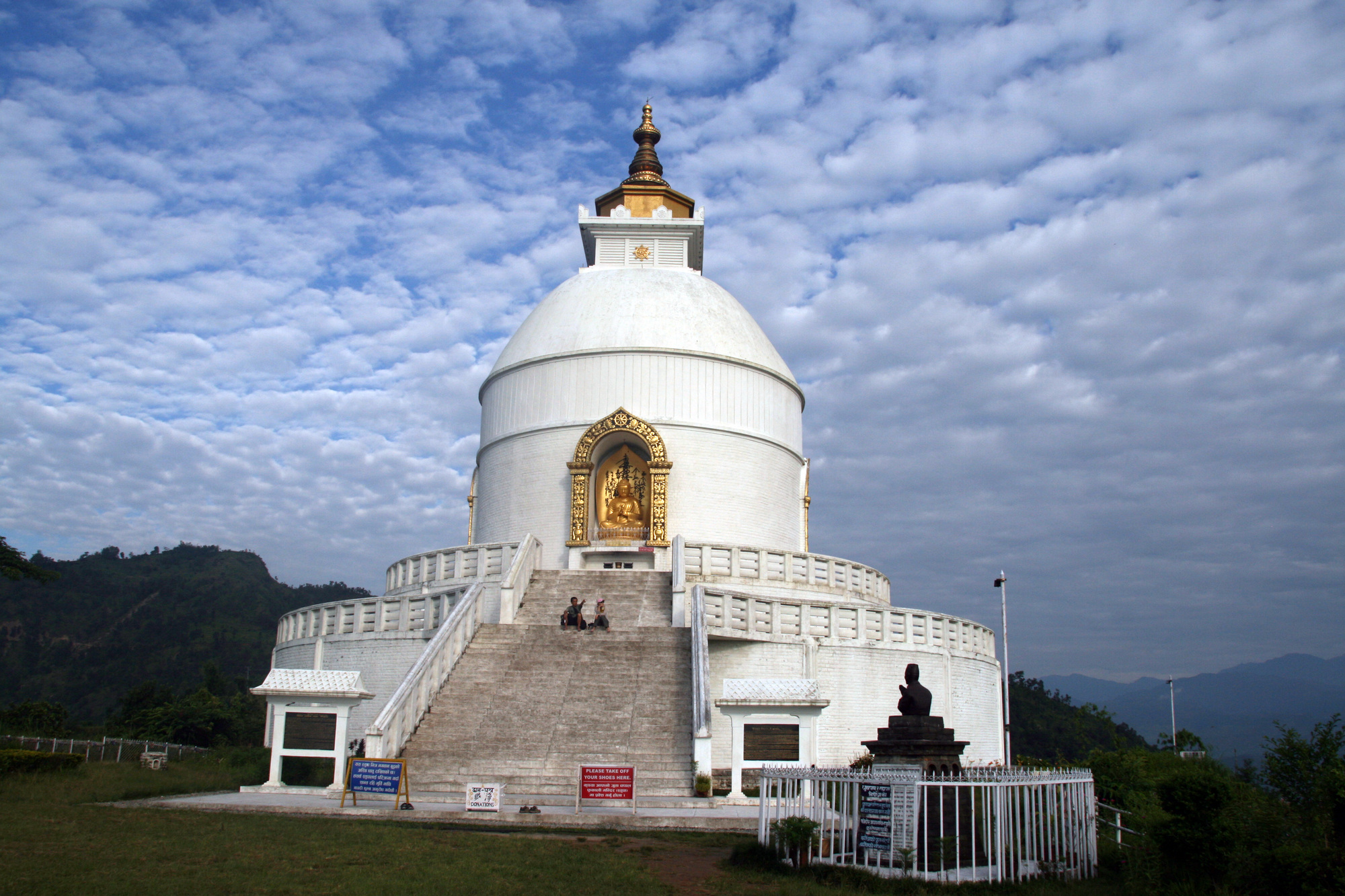 日本山妙法寺は標高1,000メートルの場所に位置する日本人が建てたお寺で、カトマンズ市内中心部から車で約40分の場所にあります。頂上付近までの道にはカフェやお土産屋などもあり、登り切った先には、フェワ湖とアンナプルナ連峰の絶景が広がっていますよ。