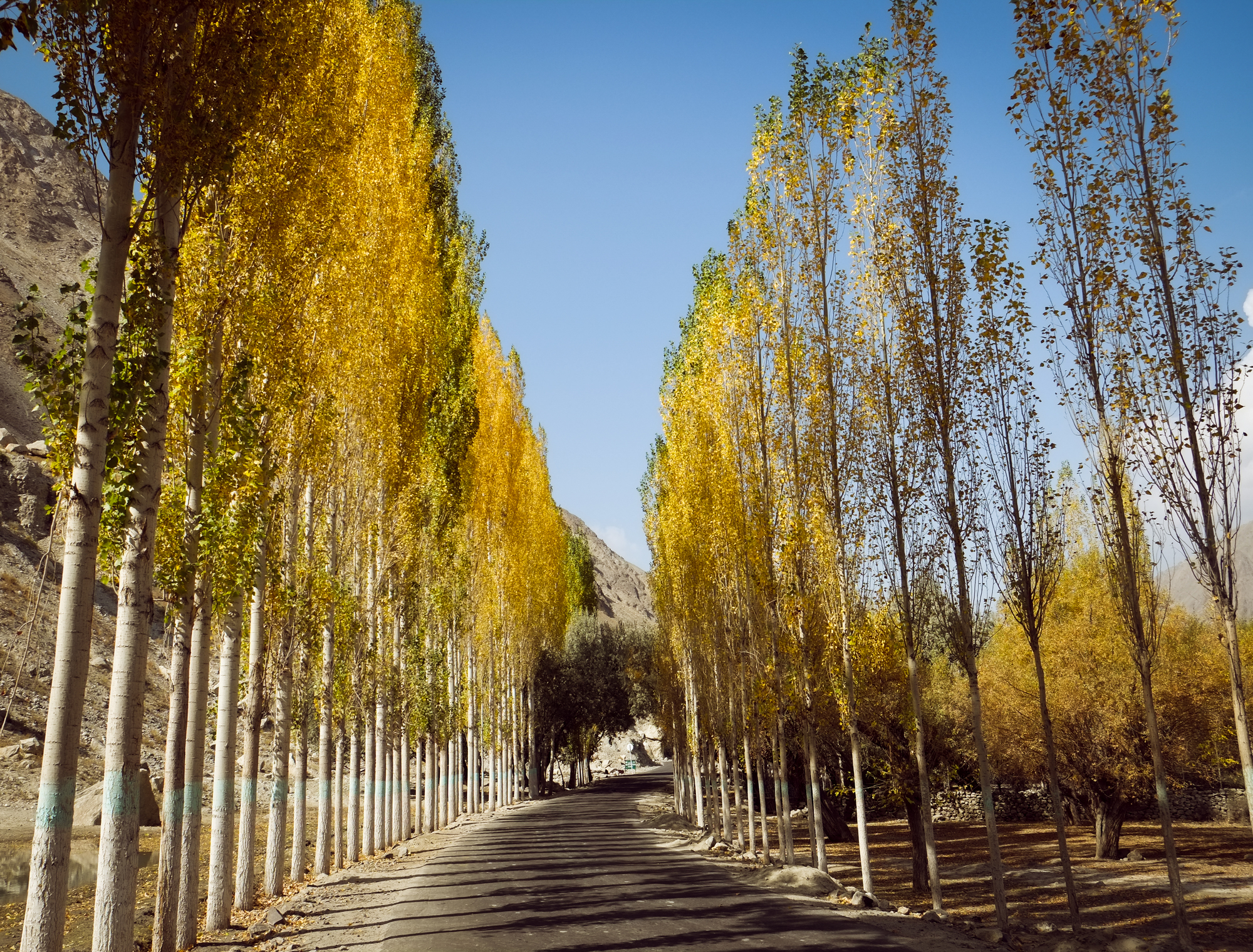 北部フンザでは、谷中のポプラ並木が一斉に黄金色に染まり、まるで絵画のような息をのむ絶景が広がります 。春の杏の花とはまた違う、燃えるような黄葉とカラコルムの青い空、そして雪を頂いた白い山々のコントラストは圧巻です。晴天率も高く、山の展望も期待できるため、写真好きにはたまらない季節でしょう。
