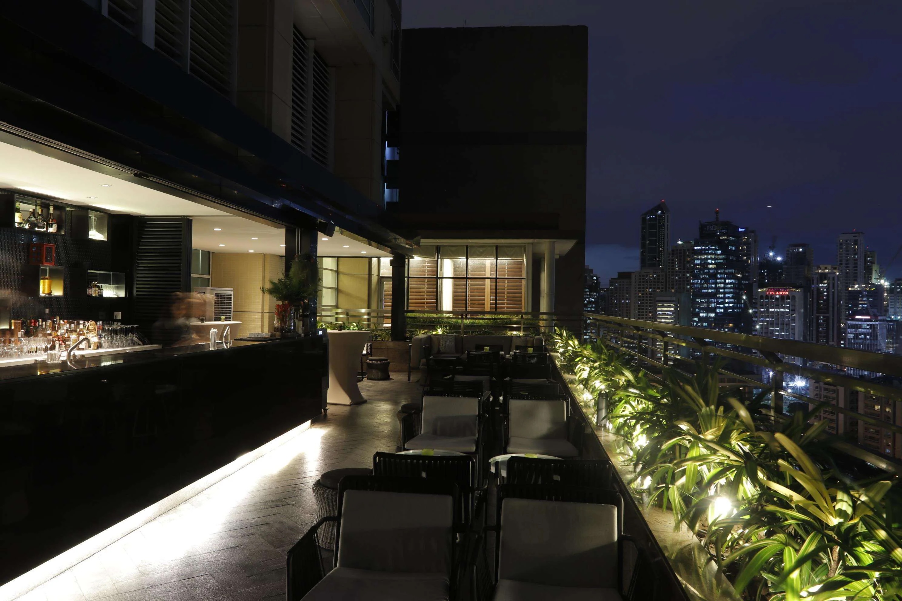 ホテルのなかでもぜひ訪れたいのは3階の屋外温水プール。20mの温水インフィニティプールで、とくに夕暮れからのマジックアワーの時間帯にはマカティの幻想的な美しさを堪能できます。