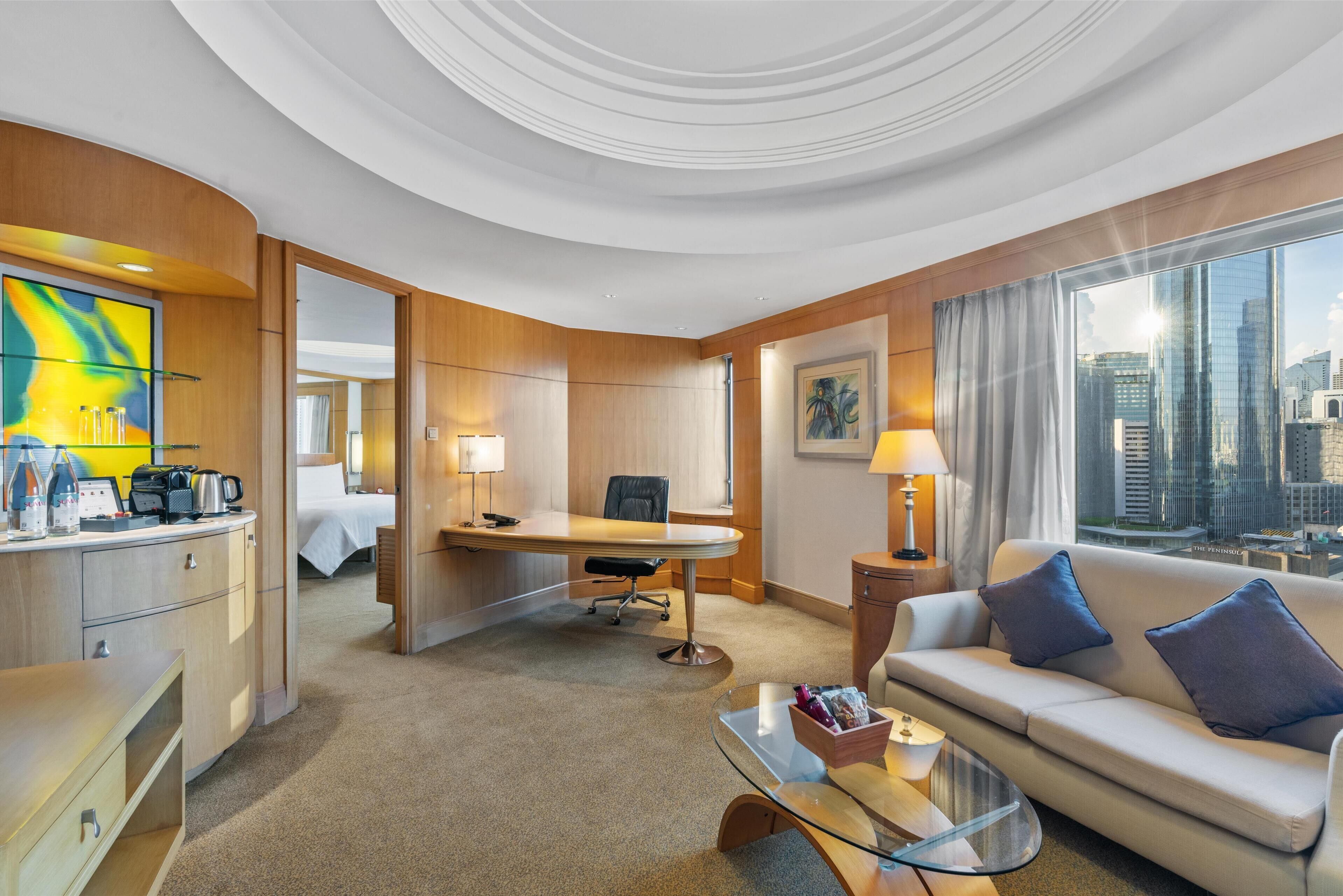 最上級のペニンシュラスイートは華やかで荘厳な雰囲気で、まさに宮殿のようなスイートルーム。専属のバトラーが24時間常駐し、完璧な滞在時間を演出してくれます。プライベートパントリーもあり、シェフに自分だけの食事をリクエストすることもできますよ。