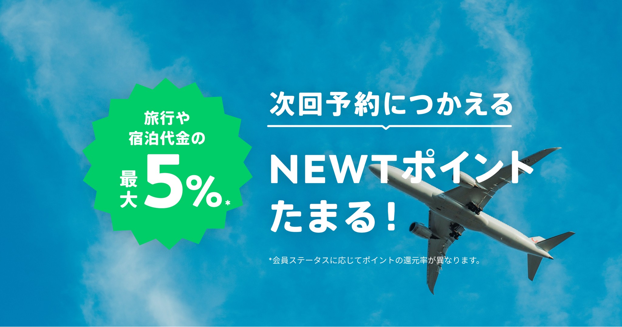 NEWTで予約した「旅行・宿泊代金の最大5%分」のポイントがたまります。ツアー帰国日(宿・ホテル予約の場合はチェックアウト日)の翌月7日がポイント付与日です。