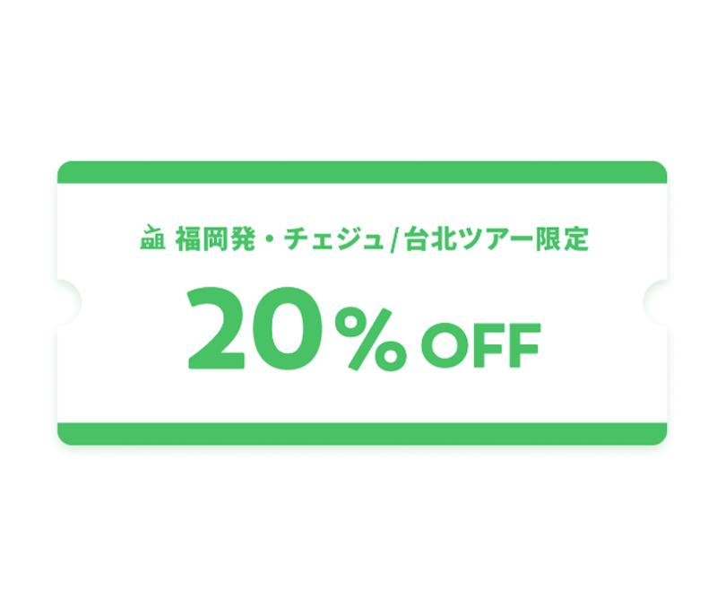 福岡空港出発のツアー限定! 今だけ福岡空港発、チェジュ&台北行きのツアーが20%OFF🌟 予約情報の入力画面でクーポンコードを入力してGET! クーポンコード:FUKUOKA20