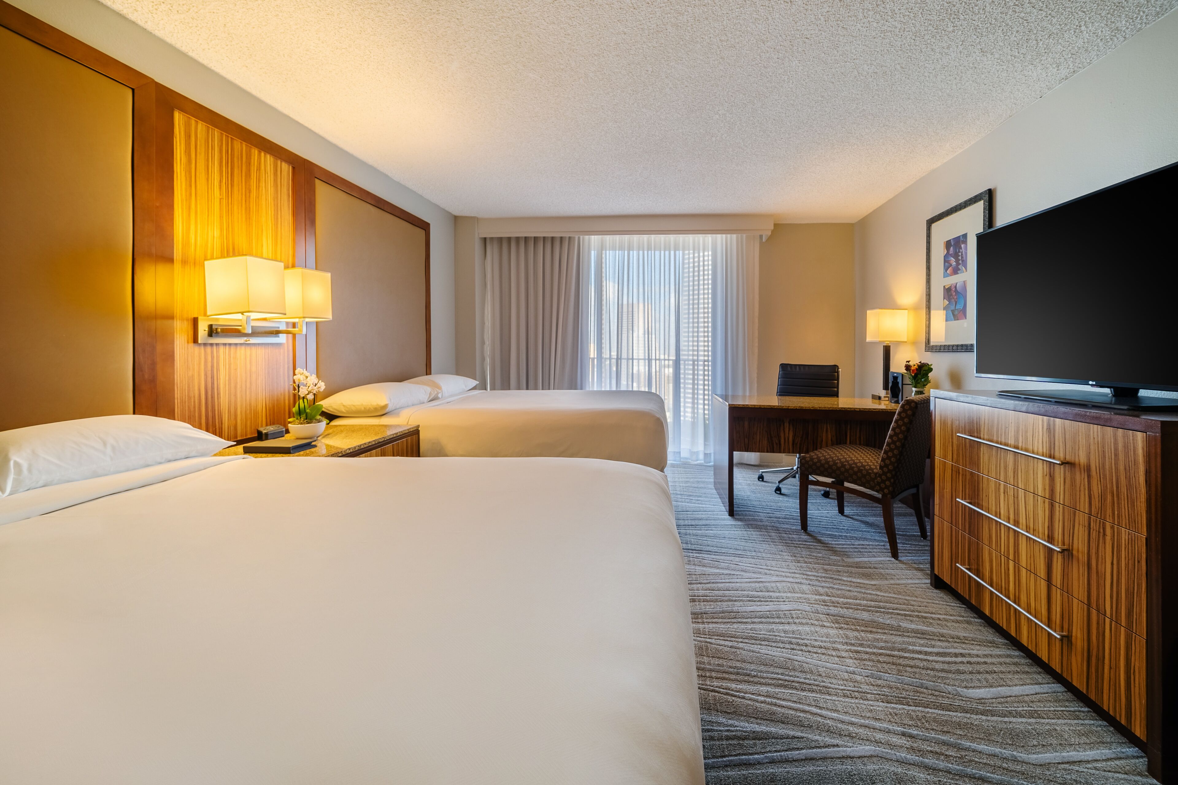 ハイアット リージェンシー マイアミのお部屋は、重厚感あふれる木製家具をそなえた全615室。ベッドのほかオフィス用のデスクとチェアも完備し、床から天井までの大きな窓からは明るい自然光が差し込みます。