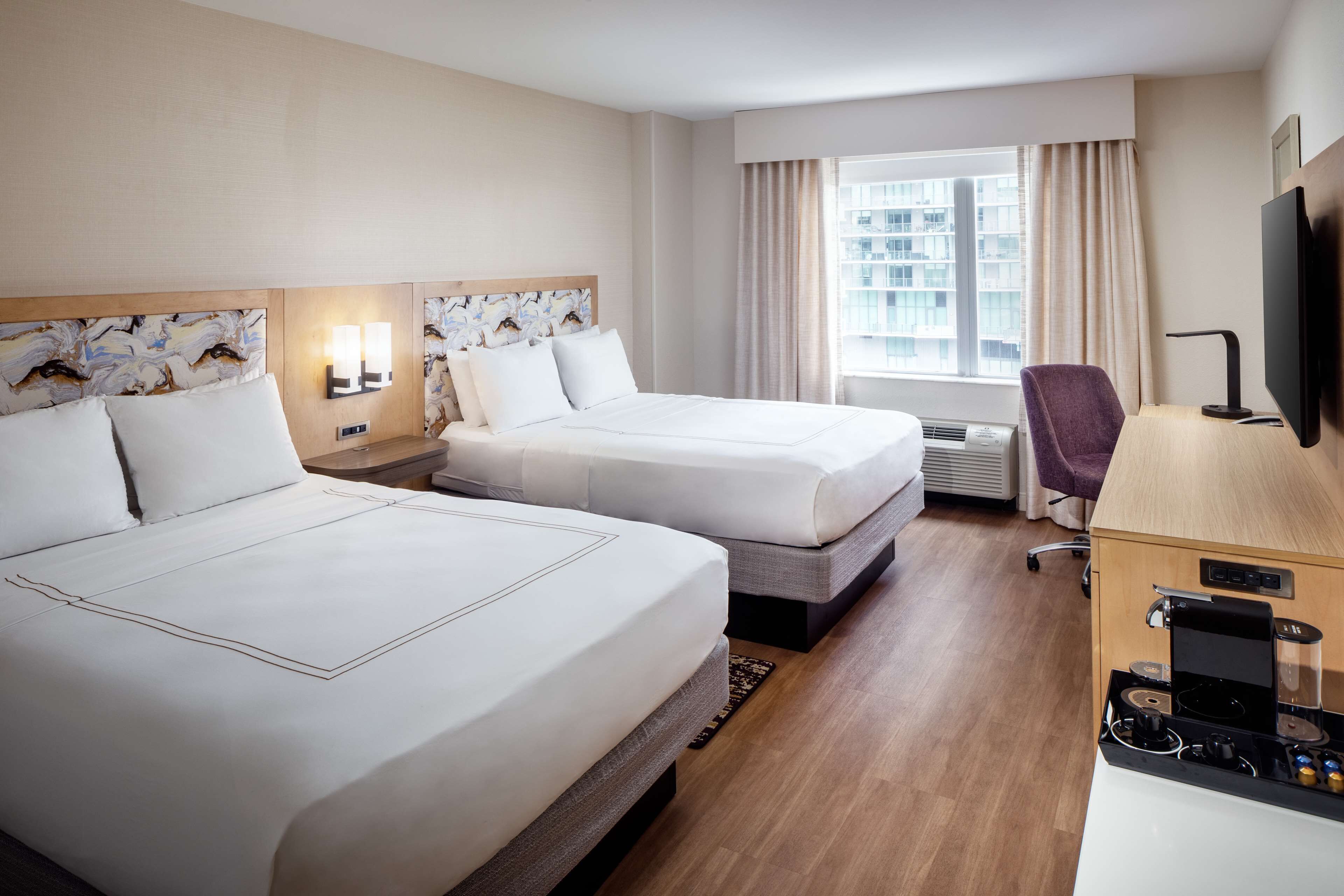 ヒルトン マイアミ ダウンタウンのお部屋は、モダンかつ落ち着いた雰囲気。お部屋とスイートは、ビスケーン湾またはマイアミの市街地を望む大きな窓が特徴で、自然光がたっぷりと注ぎ込む明るい空間となっています。