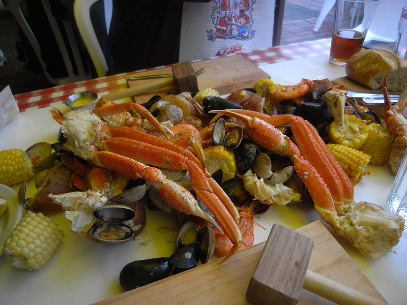 名物の「Seafeast」は、蒸しあげたカニやエビ、ムール貝などのシーフードと、ポテトやコーンなどを、テーブルクロスの代わりに敷かれた紙の上いっぱいに、直接盛り付けて食べる豪快な料理!