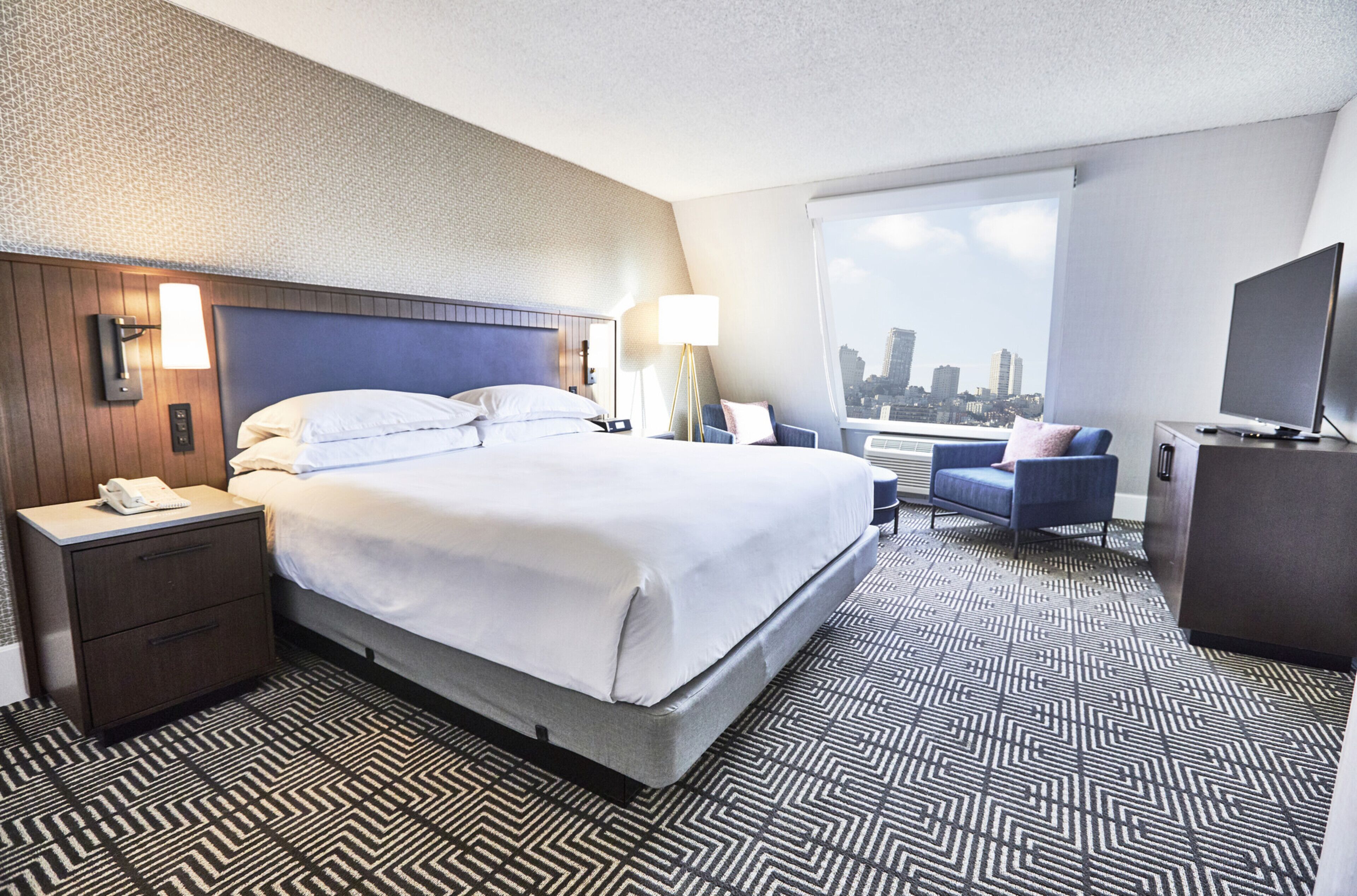 お部屋は上質さと機能性を兼ね備えた空間で、ネイビーを基調とした落ちついた色味が大人の空間を演出します。広さやレイアウトはタイプにより異なりますが、どのお部屋もベッドやソファでゆったりくつろげる造りになっており、窓からはサンフランシスコの街並みやノブヒルの景色を楽しめます。