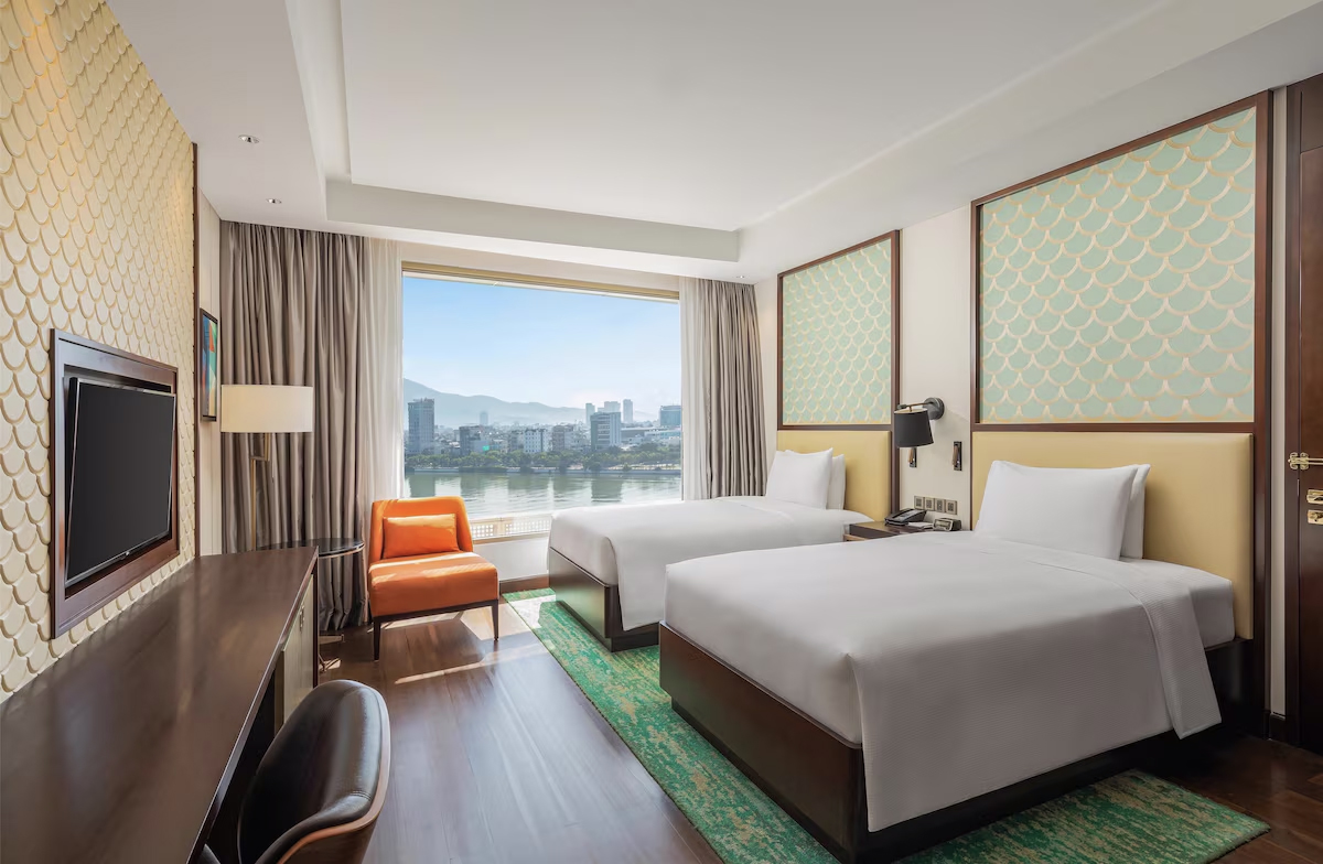 ヒルトン ダナンのお部屋は、落ち着いた色合いと上品なデザインが魅力。なかでも「ゲストルーム リバービュー」は、37㎡のゆとりある広さを誇り、大きな窓からハン川の美しい景色を一望できます。