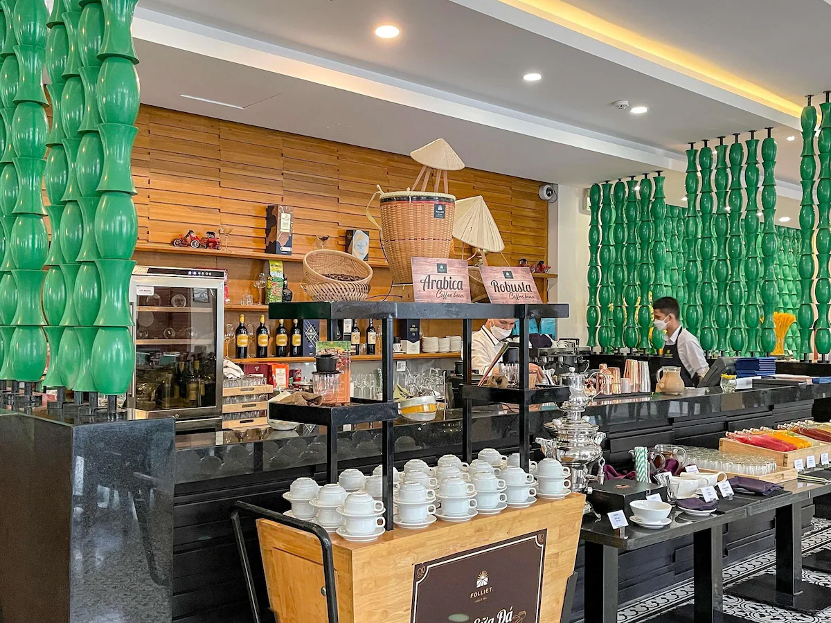 「Lemongrass」では、ベトナムの伝統料理から世界各国のメニューまで幅広く楽しめ、朝は地元の新鮮な食材や季節のフルーツを使ったビュッフェが人気!屋内席のほか、プールサイドのテラスで開放的に食事を楽しむことも可能です。